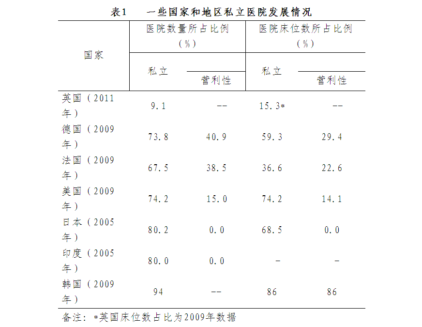 (二)“三多三少”现象突出。从机构类别看,营利性医院多,非营利性医院少。全国范围内的营利性医院占比(64.4%)远高于非营利性医院(35.6%)。天津市2011年以来已经或即将开业的具有一定规模的20家社会办医机构中,只有1家为非营利性机构。温州市66家非公立医院中,营利性医院为58家(占88%)。这与发达国家出于慈善目的,且主要举办非营利性医院的状况截然不同。如在美国,虽然近75%的医院为私立医院,但其中85%以上为非营利性(见表1)。从投资主体看,“小资本”多,“大资本”少。在非公立医疗机构中,规模较小的村卫生室占比就达到了47.9%,其投资主体大多为乡村医生个人和村集体。获得三级医院资格的非公立医院全国只有66家,占非公立医院总数的0.7%。50张床位以下的非公立医院占比高达61%,500张及以上床位的只有92所(占1.0%)。如以中外合资合作医疗机构投资最低额度需2000万元为比照,在民办资本发达的温州市也只有45家非公立医院(占比68%)达到这一投资要求。从业务发展看,强调做大做强的多,追求做精做细的少。非公立医疗机构过多地关注上等级、上规模,增加床位和大型医用设备,而对于如何更好地坚持以人为本的理念,如何强化内部管理,转变服务模式,创新管理理念关注不够。有些民营医疗机构一味强调将医院做大做强,强调多收病人住院,强调自身经济效益,甚至希望能够到资本市场上去“上市”。对于如何做精做细,做出特色,提高医疗技术水平和服务水平追求不多。