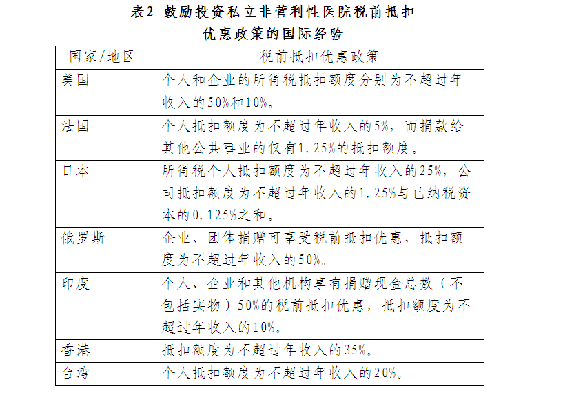 (二)大力发展非营利性医疗机构。要采取有力的政策措施,支持和吸引一批具有较大规模的社会资本举办非营利性医院。据对有关国家和地区经验分析,向非营利性医院的捐赠可享受所得税或遗产税等税前抵扣优惠,向营利性医院的捐赠则不能获得税收减免资格。如美国规定向非营利性医院捐赠的个人或企业享受税前抵扣优惠政策,个人和企业的所得税抵扣额度分别为不超过年收入的50%和10%。同时允许私立非营利性医院发行免税债券融资用于基础建设和设备购买,个人和企业购买医院债券后获得的利息收入,免于缴纳所得税(表2)。借鉴这些经验,建议对于企业、个人向非营利性医疗机构捐赠的财产(现金、物品、房地产、有价证券等)准予税前扣除,免于征收相关行政事业性收费。同时,要及时将非营利性医疗机构纳入医保定点和政府购买服务范畴。同时要注重发挥政协、统战和工商联等各方面的作用,动员一批境内外有实力、有社会责任感的企业、团体和个人兴办一批规模大并能够做精做细的非营利性医疗机构,起到很好的示范带头作用。同时也可扶持有较高水平的个人兴办医疗机构(如个体诊所等)。对这些组织、企业和个人给予一定的荣誉待遇等。此外,针对人才队伍建设不足的突出问题,与营利性医院相比,对于非营利性医院可以实现“六个优先”:大型公立医院对口合作优先开展,医学高等院校教学医院优先纳入,医师多点执业和高层次人才优先开放,重点学科建设优先支持,医疗机构检验检查资源优先共享,大型医用设备优先配置。