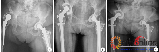 图 1 患者,女,62 岁,右侧人工全髋关节置换术后18 年出现右髋关节严重疼痛,活动受限,行右侧髋关节翻修术X 线片。 a 为术前,b为术后即刻,c为术后3 年