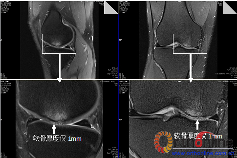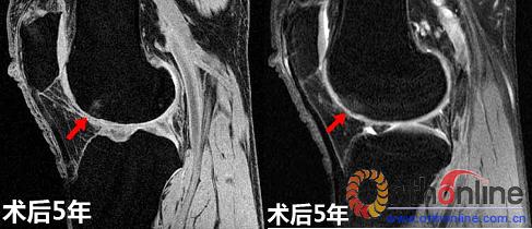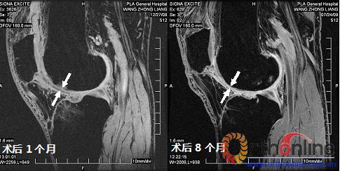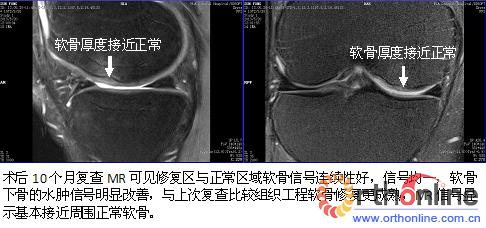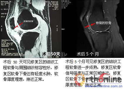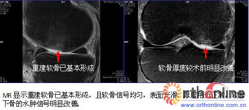 典型病例2:王XX,男,42岁,右膝关节外伤后疼痛6年,加重11个月。曾在当地医院就诊,采用保守治疗,口服止痛药物,封闭、针灸治疗,可略缓解。此后间歇出现疼痛,下地走路后疼痛加重,经休息后疼痛可减轻。近1年来,上述症状加重,休息时亦有疼痛,行走时疼痛加重,可忍痛行走200米,不能下蹲,严重影响生活,服药效果不佳。右膝MR内侧半月板前后角退行性变,右股骨内侧髁骨软骨退行性变。于2008年在我院接受软骨移植治疗。