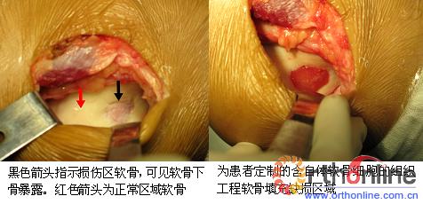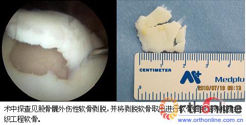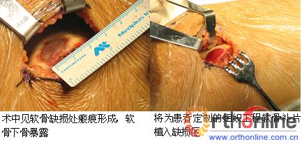 初次手术通过关节镜微创检查,确定软骨损伤部位、大小,并标记备案。并从髁间窝非负重区获取正常的软骨细胞进行体外培养。用扩增的软骨种子细胞制作“软骨补片”,第二次手术再将“软骨补片”移植入损伤处,完成修复。