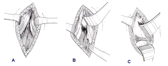 A,沿阔筋膜张肌和缝匠肌间隙分离;B,显露股直肌;C,将股直肌牵向内侧