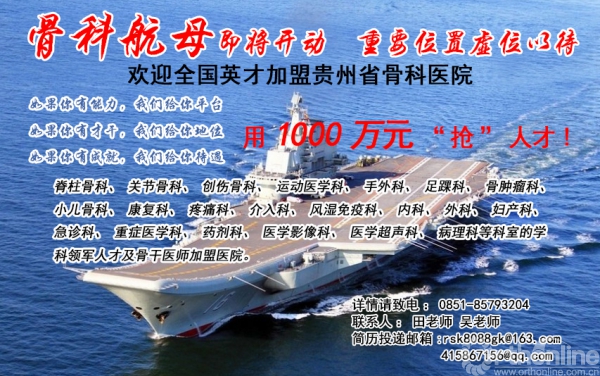 欢迎脊柱骨科、关节骨科、创伤骨科、运动医学科、手外科、足踝科、骨肿瘤科、小儿骨科、康复科、疼痛科、介入科、风湿免疫科、内科、外科、妇产科、急诊科、重症医学科、药剂科、医学影像科、医学超声科、病理科等科室的学科领军人才及骨干医师加盟贵州省骨科医院。