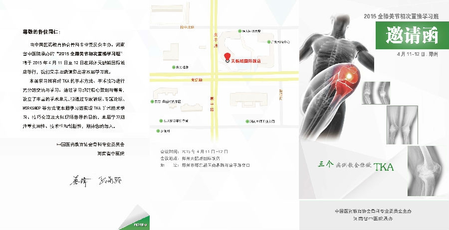 由中国医药教育协会骨科专业委员会主办,河南省中医院承办的2015全膝关节初次置换学习班将于2015年4月11-12日在郑州天鹅城国际饭店举行。