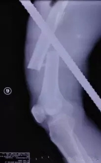 随后,由创伤骨科孙旭大夫主刀取另外一根钢筋。这根钢筋是从右腿后侧插入体内后从前方穿出,造成患者股骨干骨折,但幸运的是钢筋的走势虽然离重要的血管特别近,但是并未伤及。为了减小二次伤害,孙旭大夫决定采取直接将钢筋拔出的手术方案。