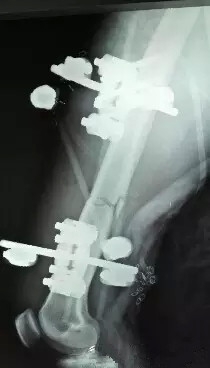 孙旭大夫摸着患者的足背动脉搏动将钢筋从大腿中一点点撤出。在钢筋走形的路径里,采用了外科专用的清洗设备进行伤口清理和清创,同时进行了骨折复位。孙大夫考虑内固定架可能会引起伤口感染风险,于是采用了外固定架,手术持续了近两个小时,顺利完成。患者的生命保住了。