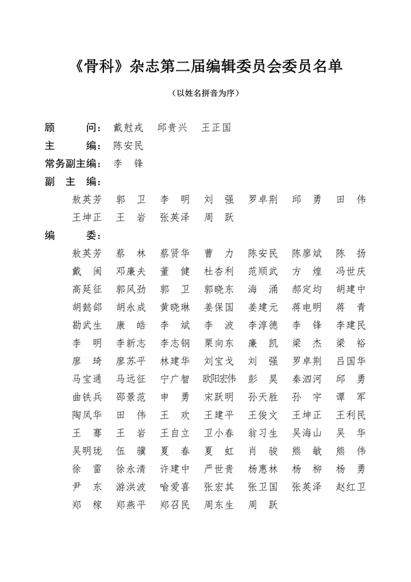 《骨科》杂志第二届编委会由106位专家组成,设顾问3人,主编1人,常务副主编1人,副主编11人,新一届编委会成员分布于全国25个省市地区。本次会议由《骨科》杂志常务副主编、华中科技大学同济医学院附属同济医院骨科主任李锋教授主持。