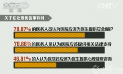 调研数据还显示,发生伤医事件时,院方采取不顾是非息事宁人和无任何表示的占到了41.86%,关于在处理伤医事件时,78.87%的医务人员认为医院应该为医生提供安全保护,70.86%的医务人员认为医院应该提供相关法律支持,46.81%的人认为医院还应该为医生提供心理健康咨询。