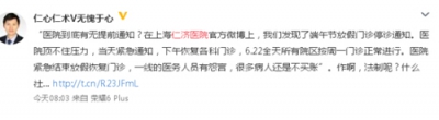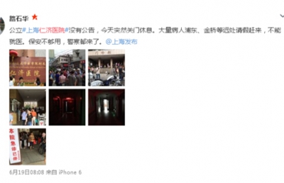6.19日,有网友指出:仁济医院在没有通告的情况下放假了。患者辛苦从远方赶来,却见不到医生,保安无法安抚患者,连警察都出动了。