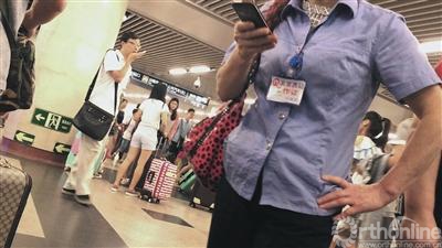 7月4日,北京西站A2出口,一名“医托”胸口挂着“北京西站工作证”。