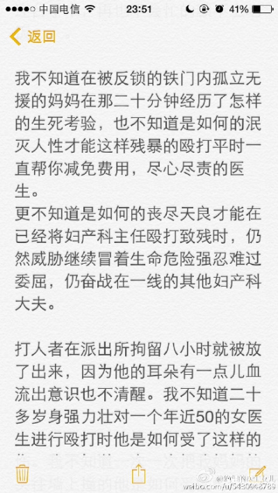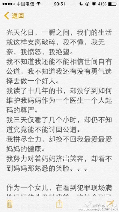 @秦孝公i:我看到一个无辜的女性被有暴力倾向的男性残忍殴打,我看到一个希望帮助他人的善人被施暴者施加暴力,我看到一位恪敬职守的医生为了自己的患者被其家属伤至昏迷……我多么多么绝望啊,因为我看到这么多的错误和人性的灭绝,却没有看到正义和法律