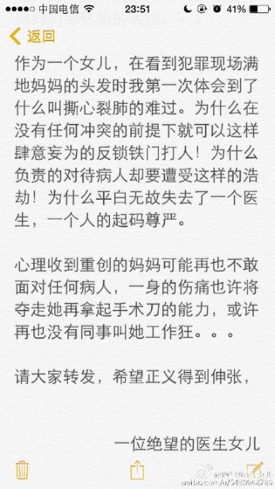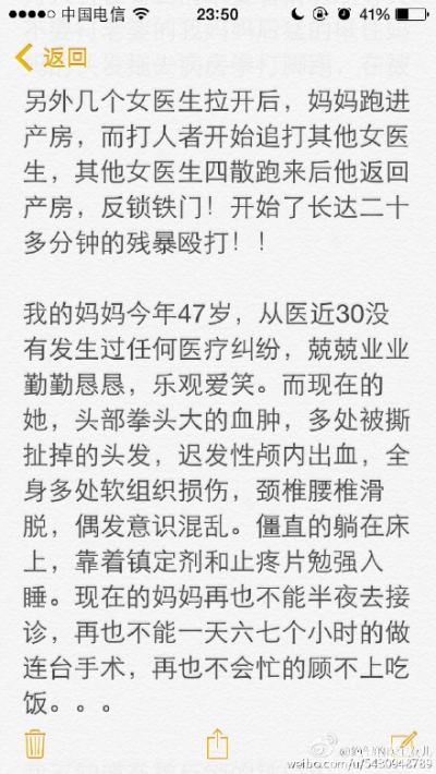 2015年7月19日,新浪微博名为@绝望的医生女儿发微博称:2015年7月18日上午十一时左右,在河南省安阳市第五人民医院发生了一起灭绝人性的恶性伤医事件,在没有任何医疗纠纷的前提下,只因妇产科女医生前去劝导女病患的丈夫不要殴打该女病患,这位灭绝人性的施暴者竟将女医生在反锁的房间内进行及其残暴的殴打近二十分钟。。。而这个女医生,就是我的妈妈