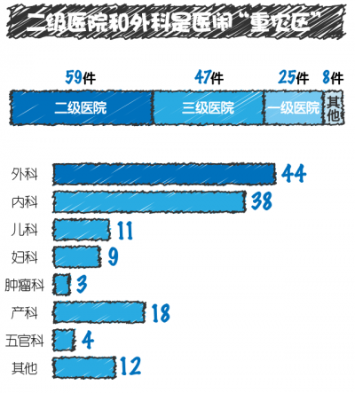 外科、内科、产科是出现医闹最多的科室。这些科室医疗风险高、手术多,病患死亡率也较高,所以医闹常集中在这些科室。