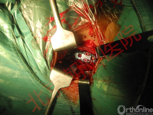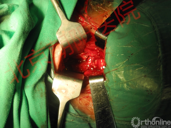 次全切除C6椎体,见椎体后方硬脊膜表面无明显脓液,有炎性肉芽组织,小心分离切除之,少部分肉芽组织与硬脊膜粘连严重,未予强行分离,以免硬脊膜破裂。