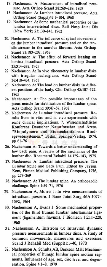 这个作者Nachemson A在20世纪6、70年代发表了若干文章关于腰椎间盘压力在不同体位下的测定,在该领域做出了不可忽略的贡献,从下面列举出他所发表的文章就可知一二,感兴趣的看官可以自行下载。