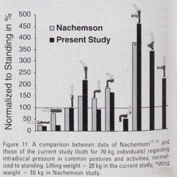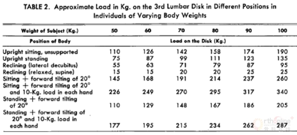 关于两文的区别,从上图就可以很直观的看到该文与Nachemson文章的不同及相同点。其中最大的不同点是无支撑的直立坐位比直立站位腰椎间盘压力稍低,而不是Nachemson文章认为的坐位比站位高40%。