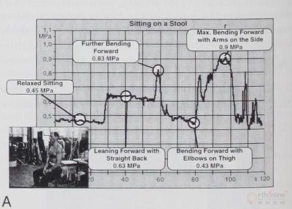 坐在板凳上,放松坐位0.45MPa,前倾坐位0.63MPa,最大程度的前倾,双臂垂在两侧,0.9MPa,前倾保持双肘支在大腿上0.43MPa。