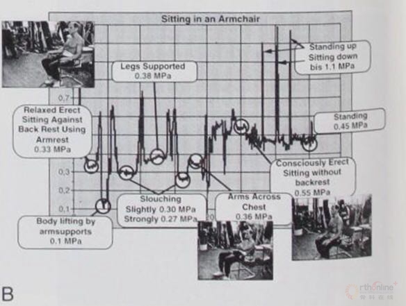 坐在椅子上又不一样。放松的直立坐位同时后背倚靠扶手,0.33MPa,双臂交叉胸壁,0.36MPa,如果能放松坐位而且耷拉着身体,则压力降低为0.27-0.30MPa,如果身体倚靠靠背支撑,压力最低0.1MPa。