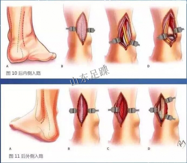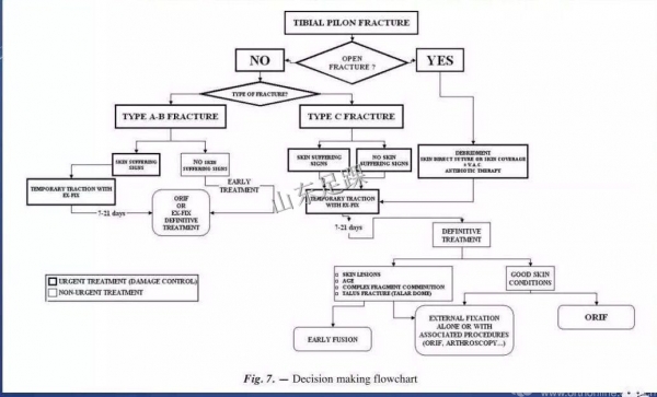 (2)一期:(恢复肢体长度和力线)跟骨牵引;外固定;腓骨骨折复位内固定、胫骨后踝骨折有限切开复位内固定;预防血栓。