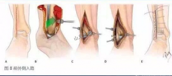 骨折为外翻畸形,选用外侧支撑钢板,使用前外侧入路;