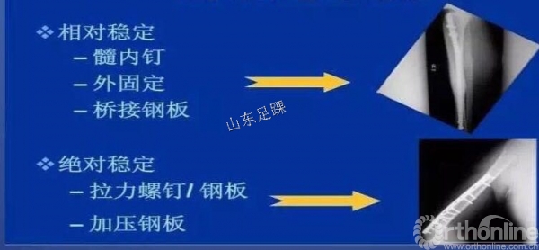 由于局部软组织条件不允许而不能使用支撑钢板的,可以使用锁定钢板进行固定,可以不直接放在需要支撑的骨折处,而是放在对侧,依靠锁定钉来提供稳定。