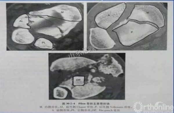 复位胫骨远端关节面时,需要辨认3个主要的骨折块:Volkmann骨块、Chaput骨块和内踝骨块。