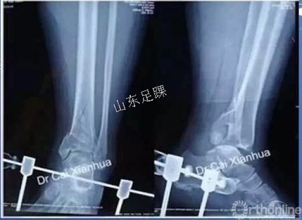 大部分作为分期治疗的首期治疗。外架固定针一定要超出内固定钢板的位置(钢板不能跨外架固定针固定,增加感染机率)。
