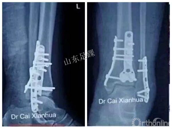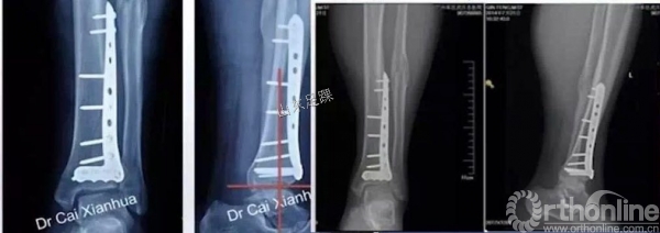 (5)胫骨大部分钢板放置在前外侧,腓骨大部分放置在后侧或后外侧。