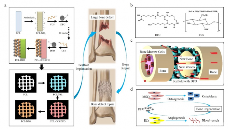 该团队通过自组装的方法构建了负载去铁胺(DFO)的3D打印聚己内酯(PCL)骨修复支架。体内外研究表明,构建的3D打印支架具有优异的血管化和成骨活性,能够快速的促进大鼠股骨远端巨大骨缺损的修复。利用DFO来激活HIF-1α信号通路,不仅对血管化和骨发生发育的偶联具有重要调控作用,同时还证实了其对成骨前体细胞向成骨细胞的分化成熟也有影响。