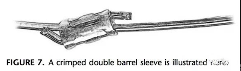 有个金属套夹,钢丝两头相向穿过套夹,专用工具把钢丝收紧后再把套夹夹扁,锁紧钢丝。钛缆就类似这个锁紧方式。