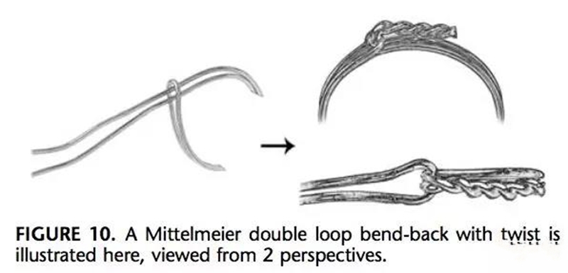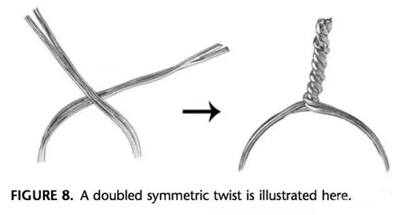 和发夹袢扭结类似,不过是双股钢丝全部穿过环袢,扯紧,尾端扭结,折弯。