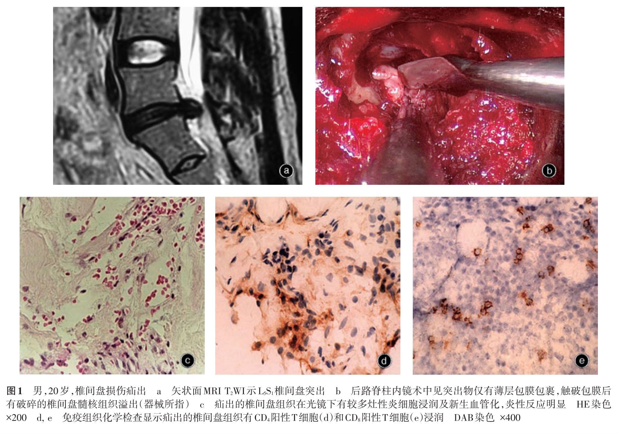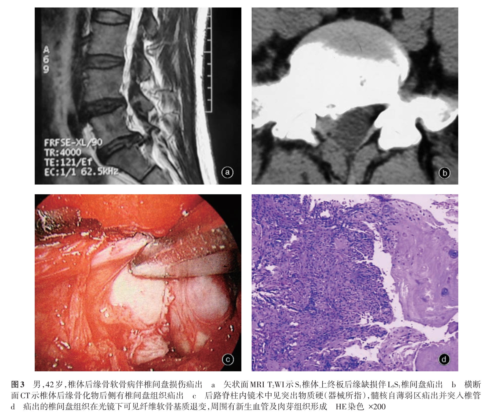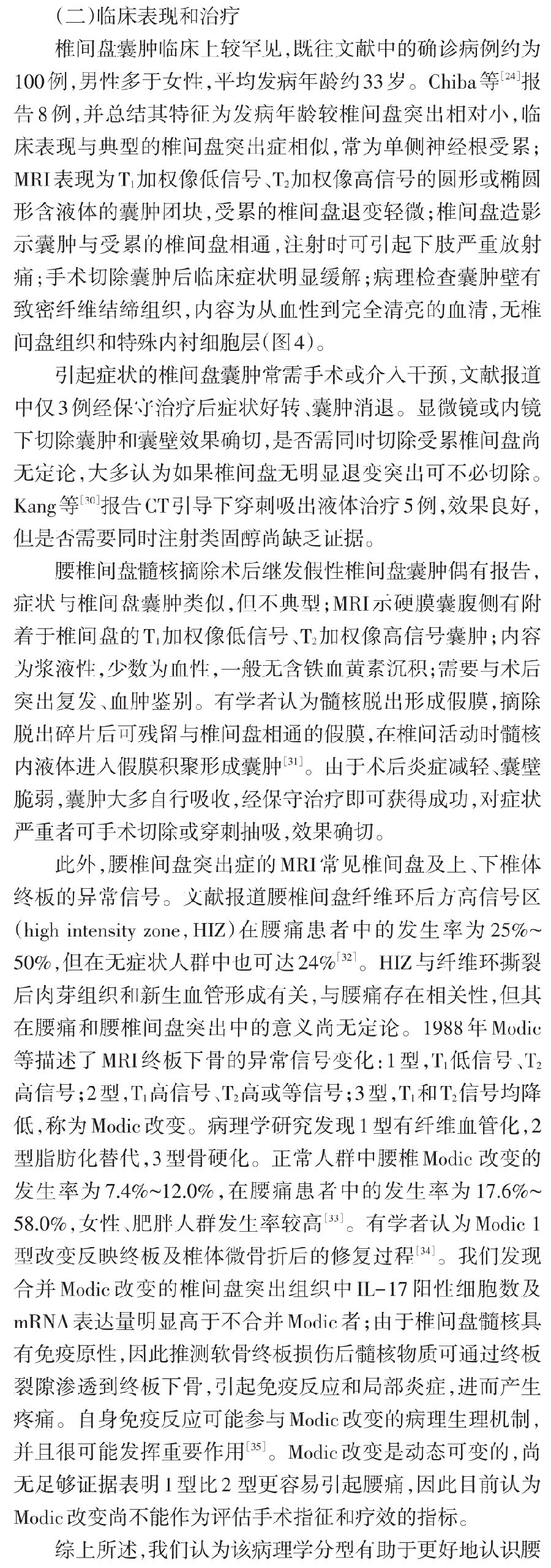 我们在临床实践中发现腰椎间盘突出症在大体病理、免疫学等方面存在较大差异,病变周围组织也有不同的病理改变,存在不同的发病机制,其治疗措施包括手术方法因不同的病理变化而有所差异。基于以上认识,我们在以往分类方法的基础上提出一种新的腰椎间盘突出症病理学分型,分为损伤疝出型、退变突出型、椎体后缘骨软骨病伴椎间盘突出和椎间盘囊肿四型[5-11],并建议根据不同的病理类型进行临床评估,包括手术方法的选择。