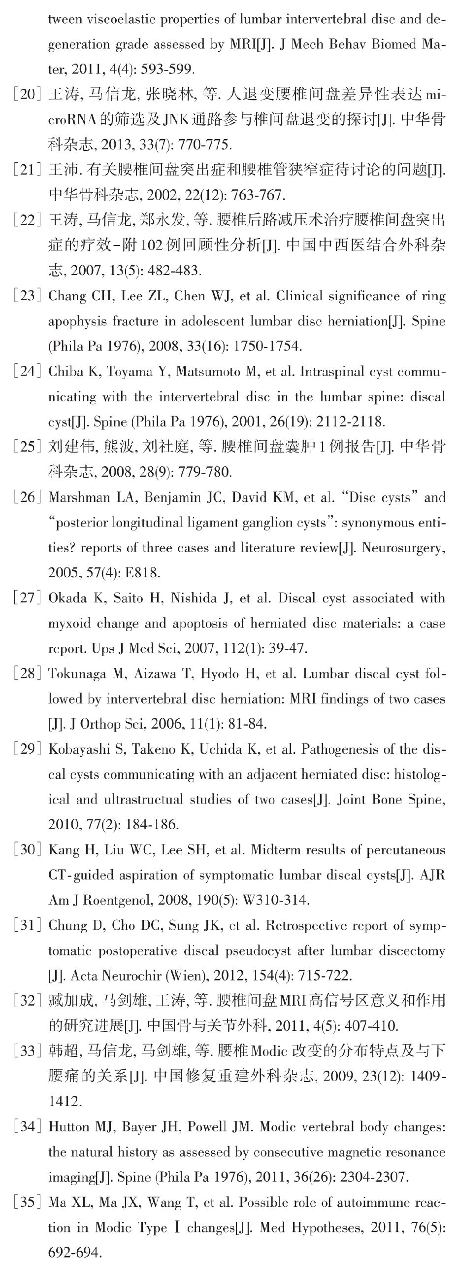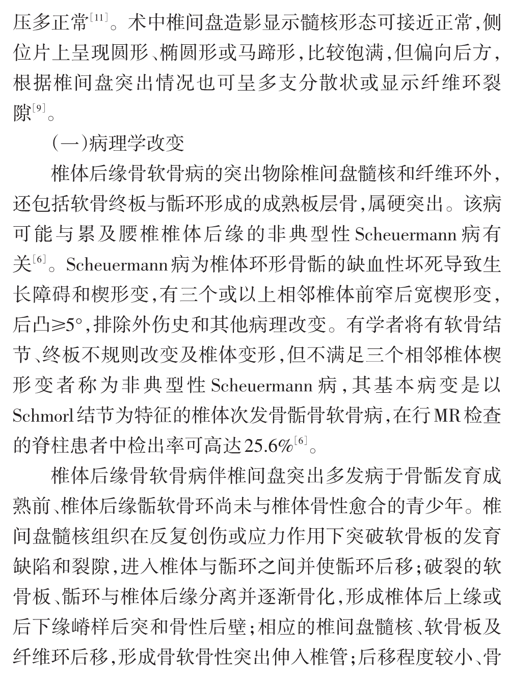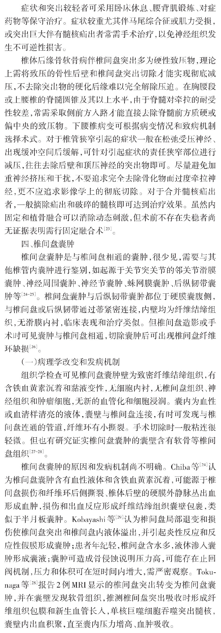 我们在临床实践中发现腰椎间盘突出症在大体病理、免疫学等方面存在较大差异,病变周围组织也有不同的病理改变,存在不同的发病机制,其治疗措施包括手术方法因不同的病理变化而有所差异。基于以上认识,我们在以往分类方法的基础上提出一种新的腰椎间盘突出症病理学分型,分为损伤疝出型、退变突出型、椎体后缘骨软骨病伴椎间盘突出和椎间盘囊肿四型[5-11],并建议根据不同的病理类型进行临床评估,包括手术方法的选择。