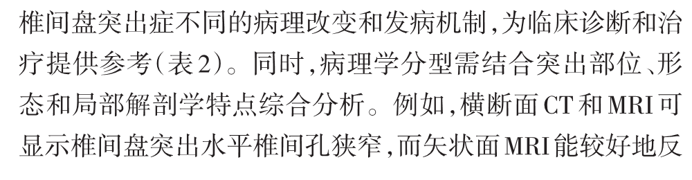 关于腰椎间盘突出症的病理学分型历来都存在较多争议。比较常用的有 MacNab分类、Spengler分类、美国矫形外科医师学会(American Academy of Orthopaedic Surgeons, AAOS)&国际腰椎研究会(International Society for the Study of Lumbar Spine, ISSLS)分类等。MacNab分类分为突出(protrusion)和疝出(herniation),前者包括局限和广泛型,后者包括脱出、破裂脱垂和游离型[1]。Spengler分类分为突出(protruded)、脱出(extruded)和游离(sequestered)[2]。 AAOS &ISSLS 分类分为退变(degeneration)、膨出(bulge)、突出(protrusion)和脱出(extrusion),后者又分为韧带下型(subligamentous)、经韧带型(transligamentous)和游离型(sequestrution)[3]。这种分类将疝出作为统称,与 MacNab 分类的疝出相矛盾。国内周秉文等[4]则将腰椎间盘突出症分为突起型、破裂型和游离型(表 1)。因此,目前临床上对腰椎间盘突出症的分型仍较为混乱。