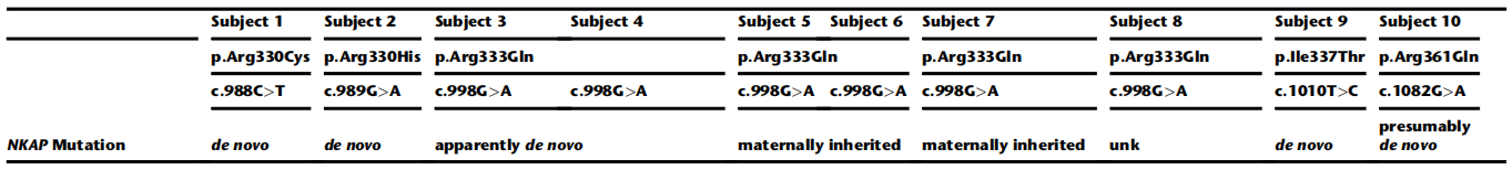 图2. 10名患者NKAP基因测序结果及突变位点分布