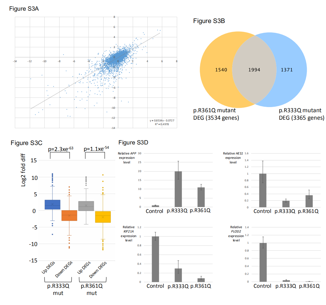 (3)对两个相近的错义突变方式对基因表达的影响进行相关性分析,发现二者相似(图6),由此初步得出结论:NKAP错义突变引起的表型差异并非源于自身表达异常,而是源于对其他基因表达的调控作用,尤其引其长基因表达下调。