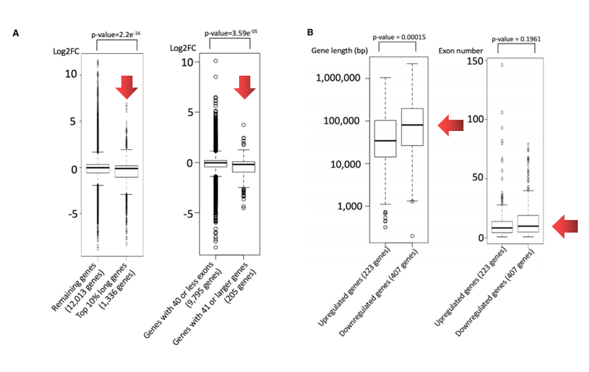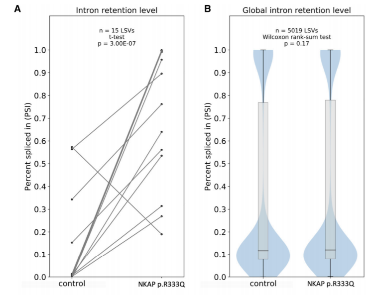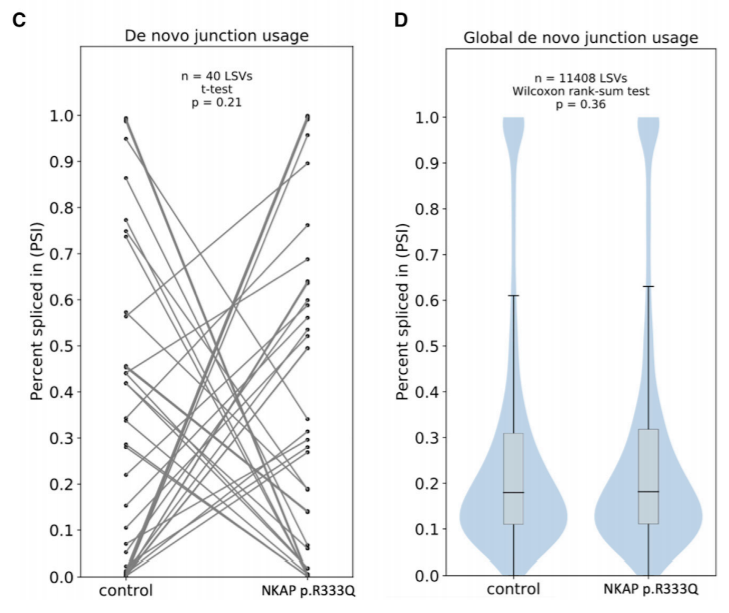 前文已提到,NKAP基因既与HDAC3结合参与mRNA剪接,同时也作为后催化P-复合体的一部分参与相邻外显子拼接和成熟mRNA释放。Kosuke Izumi教授团队并未止步于NKAP错译突变的功能探讨,进一步通过MAJIQ工具研究了其引起基因表达下调的机制,发现其并不影响剪接过程(图7),而是对外显子较多的长基因有显著调控作用(图8),由此推断可能更多地影响相邻外显子的拼接。
