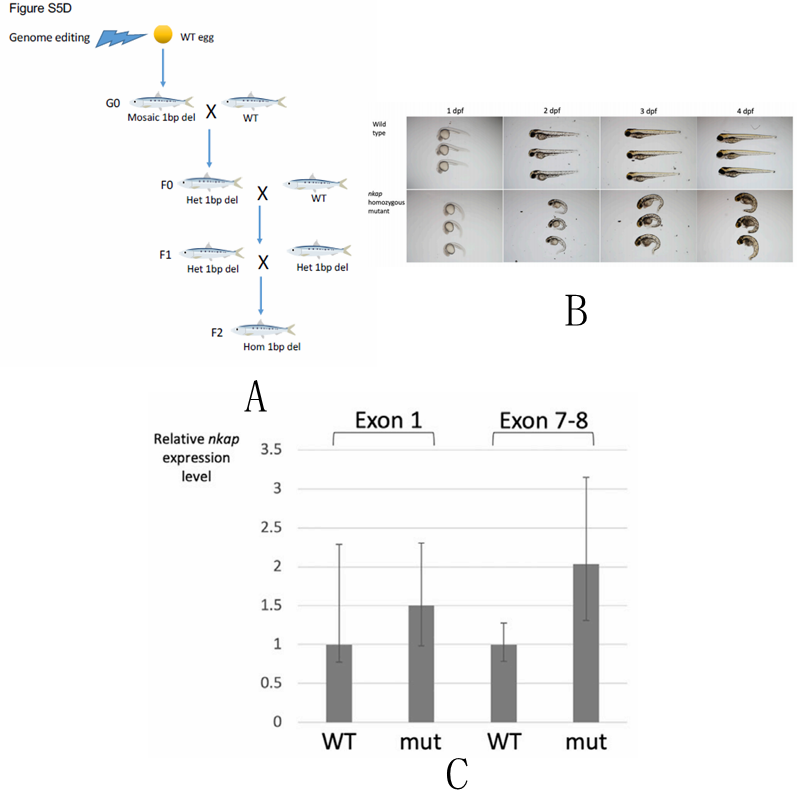 图10. A.斑马鱼模型杂交实验示意图B.野生型与纯合突变表型对比C.外显子表达情况对比