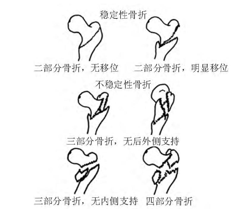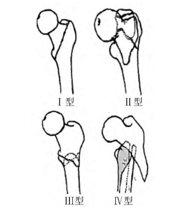 Ⅳ型:包含小转子分离的三部分骨折,内侧皮质难以解剖复位和重新恢复支撑;