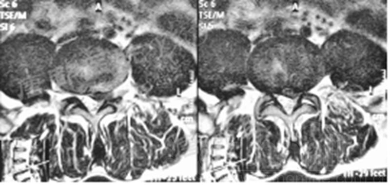 现病史:患者于6月前因“腰椎间盘突出症”于外院行后路开窗髓核摘除术。(多年支气管炎致剧烈咳嗽)术后2月咳嗽逐渐加重。1月前剧烈咳嗽后突发右下肢疼痛麻木。