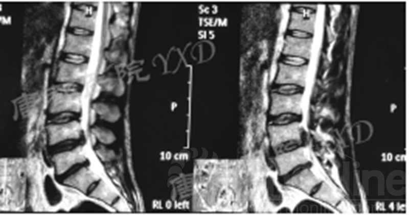 专科情况:跛行入病房;左侧直腿抬高试验阳性(60°)、加强试验阳性;左侧足背伸肌力、踇趾背伸肌力3级;左小腿外侧及足背皮肤感觉明显减退;余未见明显异常。VAS评分:左下肢7~8。