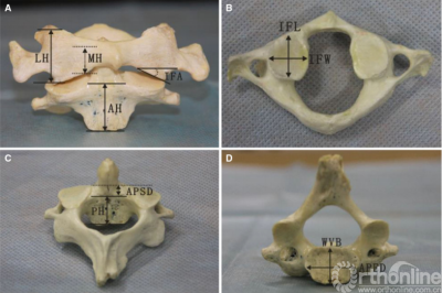 The present anatomical study on the dry bones indicated that there was enough osseous space for the ATCS placement. The C1 inferior facet width and inferior facet length was 16 and 17 mm, respectively, which were greater than the diameter of the screw (4 mm). The width and anteroposterior diameter of the C2 body at the inferior endplate was 20 and 17 mm, respectively, which were enough for 2 screws. The C2 body height was of an adequate space for two screws inserted unilaterally. Theoretically, dimensions of the atlas and axis meet the requirement for bilateral ATCS placement,