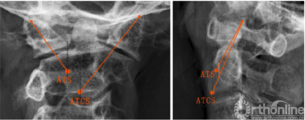 图3正位和侧位x线片上ATS和ATCS的螺钉轨迹,(左)所有螺钉对准C1上关节突上外侧角;(右)所有螺钉对准C1上关节突上角(点附近);ATCS,前路经关节交叉螺钉;ATS,前路关节交叉螺钉
