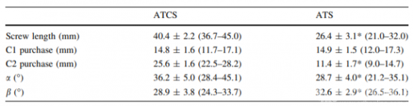测量值以平均值±标准差表示,ATCS前路经关节交叉螺钉,ATS前路关节螺钉,*表示与ATCS的差异(P<0.05)