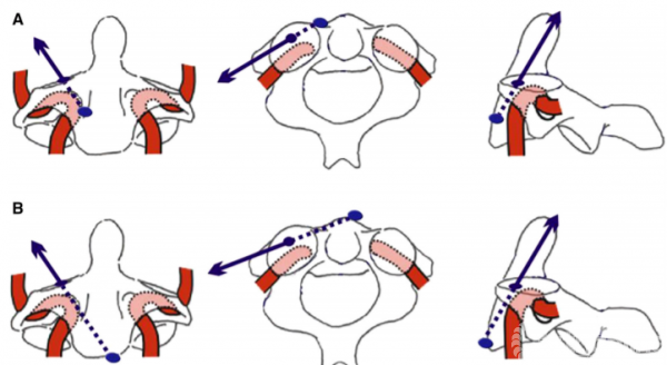Cacciola等人[14]观察到79%的椎动脉位于C2上关节突下表面的椎动脉沟内,57%的椎动脉沟位于C1后弓外侧。在这种情况下,由于存在医源性VA损伤的潜在风险,后路经关节螺钉固定是不可行的[15,16]。在这种情况下,ATS固定也很困难。对于椎动脉解剖正常的患者,以C2上关节面为中心的ATS轨迹为理想的螺钉通路。