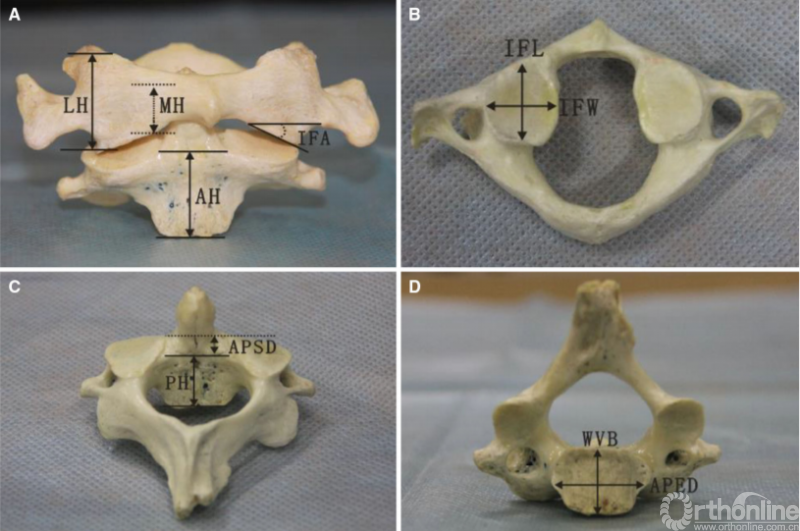 Thirty pairs of dried atlas and axis specimens were provided by the Department of Anatomy. The race, sex, and age of the specimens were unknown. The detailed morphometric parameters related to ATCS were measured, including the left and right maximum widths and anteroposterior diameters of C1 inferior facet articular surface, the left and right lateral and medial heights of C1 lateral mass, the left and right angles of C1 inferior facet relative to the transverse plane (Fig. 1a, b). We also measured the C2 anterior and posterior vertebral body heights in the midline of vertebral body, the superior and inferior anteroposterior diameters of C2 vertebral body in the midsagittal plane, the C2 vertebral width at level of the inferior endplate (Fig. 1c, d).