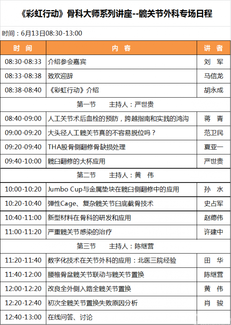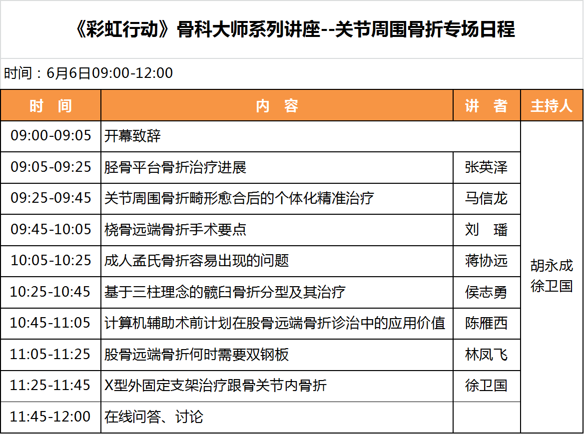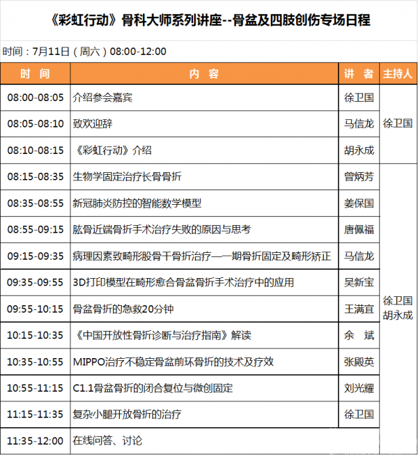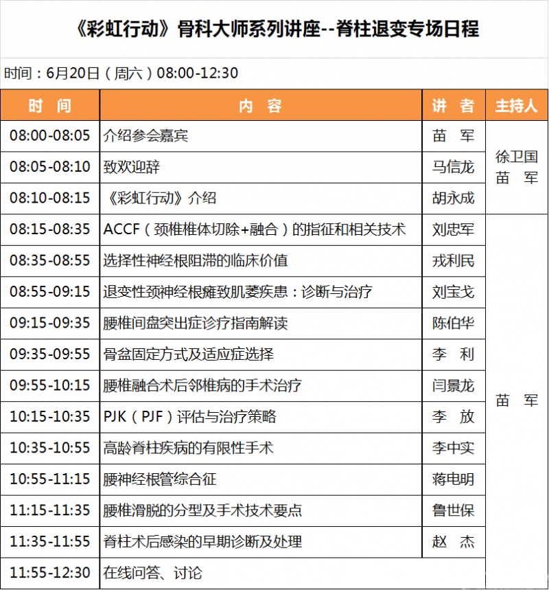 大会主席马信龙教授、执行主席徐卫国教授和胡永成教授精心策划了10场网络精品课程的学术内容,希望通过这系列骨科大师讲座,促进骨科新理论、新知识、新方法和新技术在临床的应用,使医生通过终身学习进一步推动医学的发展和进步。