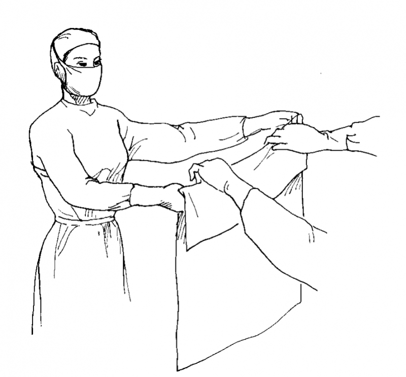 每一张无菌手术巾(单)均应由参加手术的洗手护士逐一递给铺单的手术者(图2-3-9),按无菌要求铺单。现将上、下肢和脊柱手术的铺无菌巾(单)的步骤图解如下: