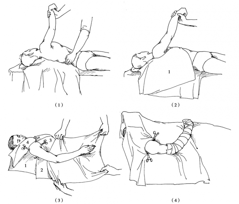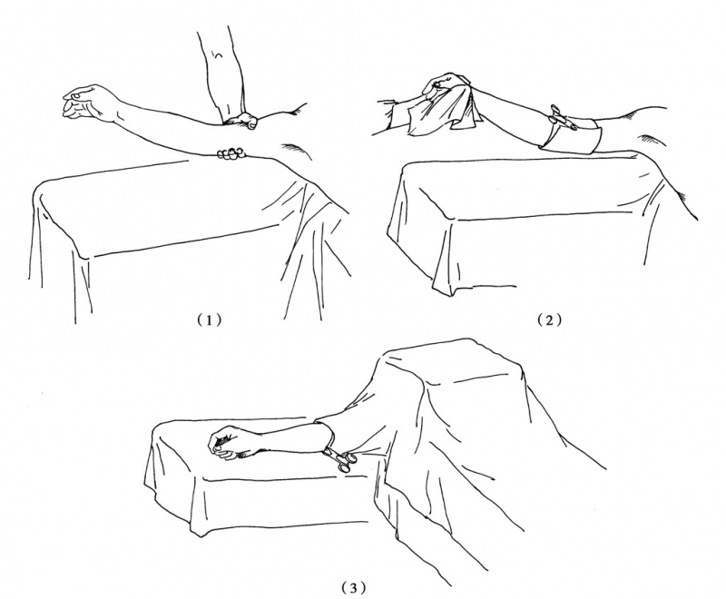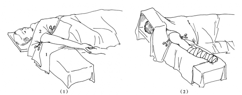 患者仰卧,患侧上肢外展后,置于手术台旁的小桌上,由巡回护士自上臂抬高前臂和手。皮肤灭菌后: