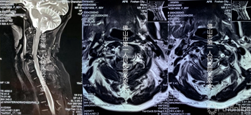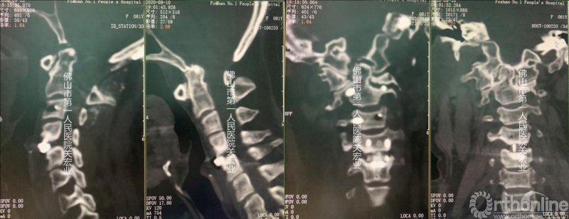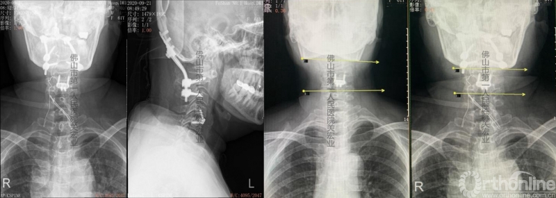 A:术后颈后、枕部向头顶的放射痛明显缓解。左上肢肌力提高一级,双侧下肢本体感觉改善。术前寰枢椎旋转脱位、下颌偏歪、齿状突上移、脊髓向右侧偏移的情况,术后影像学可见均有明显改善。